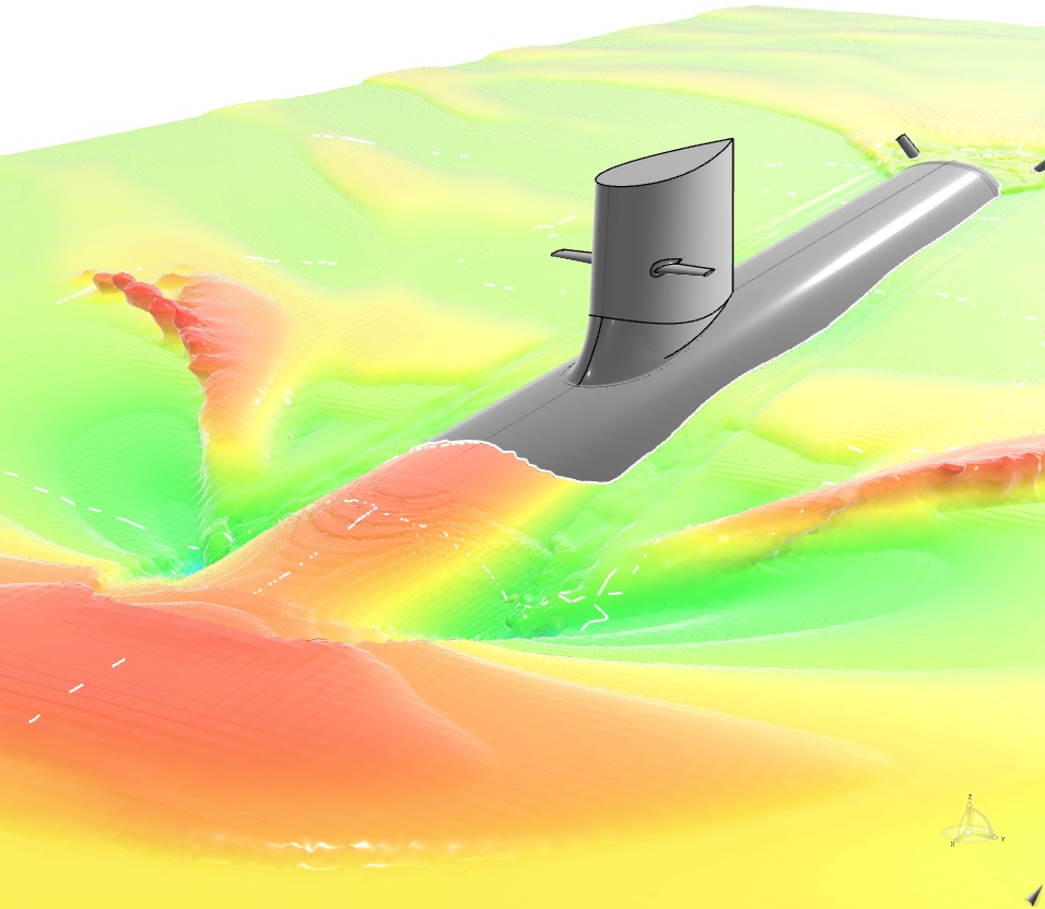 Once we have the geometry and control surfaces optimized, we can calculate the hydrodynamic wake of the submarine. We use the SIMULIA Fluid Dynamics Engineer, which takes advantage of a state-of-the-art unstructured second order fully implicit finite-volume Reynolds-Averaged Navier-Stokes (RANS) solver to model the flow, including turbulence. The interface between water and air, where the surface wake forms, is solved using the multiphase Volume of Fluid (VOF) formulation. The free surface VOF iso-contour plots are the data we need for the next stage of the simulation. Figure 3 shows an example from the semi-submerged submarine.