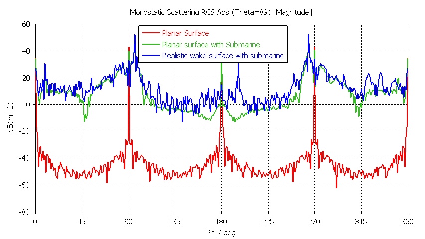 The results show that the submarine has a significant contribution to the overall RCS. The sub on a planar surface and a realistic surface has a very similar RCS, with the realistic surface dominating the planar surface at some angles. These angles are of interest, as they tell us the directions at which the excitation rays reflect off the surface of a wake, thereby compromising the stealth of the submarine.