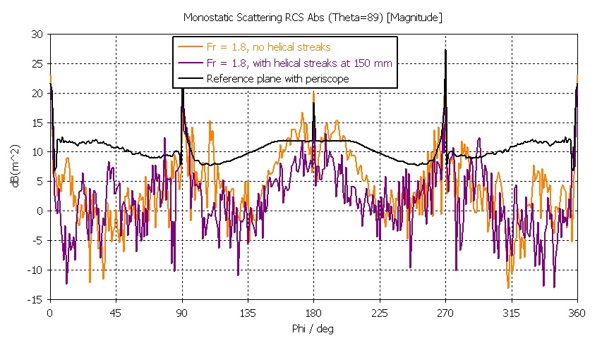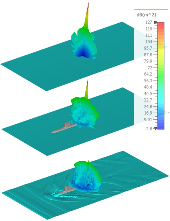 Another important factor is the radar cross section (RCS). When radar waves strike the vessel, they are reflected and scattered. The waves that are back-scattered towards the receiver are what allows an enemy to detect the submarine. Therefore, one of the basic principles of stealth design is to minimize the back-scatter. For undersea vessels near the surface, this is further complicated by hydrodynamics as the wake produces a complex free surface deformation pattern.