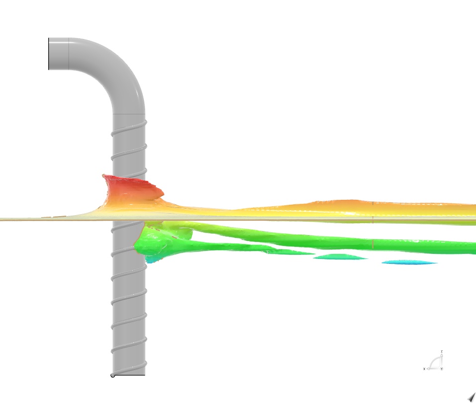 Conventional submarines use periscopes and snorkeling masts as vertical appendages to approach and breach the free surface. This means that these are a major source of hydrodynamic disturbance and turbulence. This results in an unsteady flow and a high, steep bow wave at snorkeling speeds below 5 m/s. This wave can be identified by radar or visual observation. To address this issue, baffles are added to the periscope – in this case, a helical strake running up the periscope disrupts the development of the bow wave (Figure 6). The strake model is parameterized so the thickness and pitch of the helix can be varied for a component optimization study.