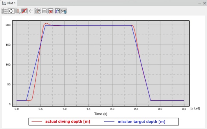 The submarine system’s dynamic behavior is modeled and simulated using the Dymola Behavior Modeling (DBM) application, which is an integrated 1D-modeling and simulation environment on the 3DEXPERIENCE platform. DBM directly generates multibody system models from CAD data and provides 3D visualization and animation capabilities of the system behavior. This is used to generate a multibody model of the submarine including control surfaces. With this, users can study the hydrodynamic behavior of the submarine under varying operational conditions or drive strategies. The control systems of ballast tanks can be accurately modeled, in order to realistically represent surfacing and diving behavior. Different drive units – for instance, diesel engines or fuel cells – can also be considered in the simulation.