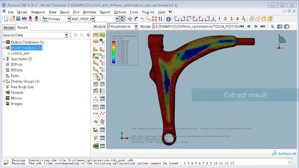 Using Abaqus/CAE you can easily setup, submit and postprocess a topology optimization. In this simple example a standard topology optimization process is shown for the example of a control arm. Starting with a design space with appropriate load scenarios a design proposal with maximum stiffness and a specified volume will be extracted. The files required for this example are provided with each Tosca Structure installation.