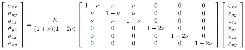 The above equation represents the generalized form of the material’s stress-strain relationship in the linear elasticity regime for isotropic materials.