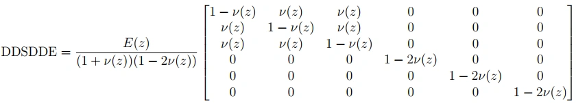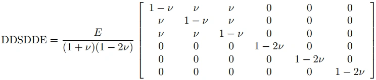 The matrix DDSDDE represents the derivative of the stress with respect to strain, and it is used for calculating the stress increment. The matrix elements are defined as follows: