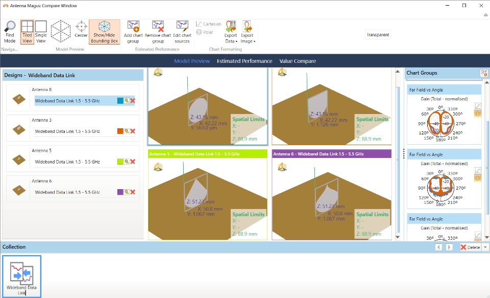 For more information about the workflow and a detailed example for a 1.5 – 5.5 GHz Data Link Antenna, see “Antenna Magus: from Farfield Cuts to Surrogate Model”.