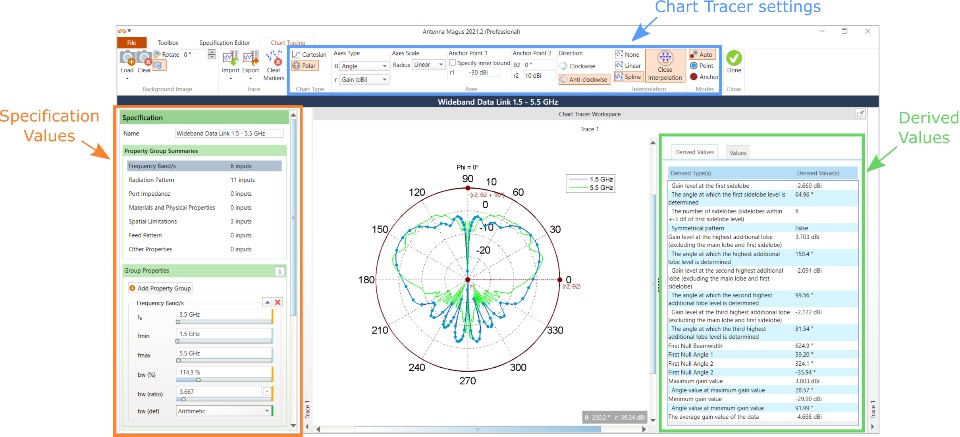 This can be done in a few simple stages. First, the user inputs the data as a specification in Antenna Magus. Radiation pattern cuts can be scanned in and traced to automatically calculate KPI’s such as gain and beamwidth. Additional keywords such as “blade”, “monopole” or “wire” can also be used to narrow down the search.