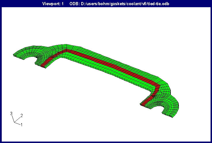 Often, gasket meshes have one gasket element through the thickness. The different colors in the gasket mesh shown here represent different gasket behaviors. The red mesh has a different gasket behavior from the green mesh.