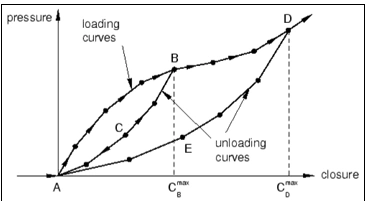 A primary loading curve is defined for this type of thickness response, accompanied by a set of unloading curves. Abaqus employs interpolation to derive the corresponding unloading behavior when unloading occurs from an intermediate pressure.