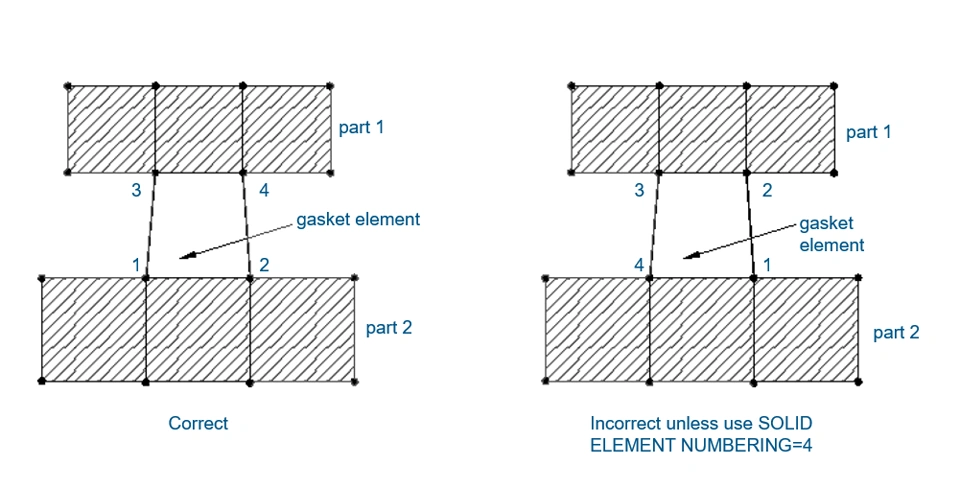 Gasket element connectivity can differ from solid element connectivity. Numbering the nodes of the gasket is crucial since it defines the gasket’s normal direction. If necessary, use the solid element numbering parameter on the element to work around this difference. This can be convenient if the mesh generator does not support gasket elements or in thermal stress analyses where continuum elements are used to model the heat conduction in the gasket.