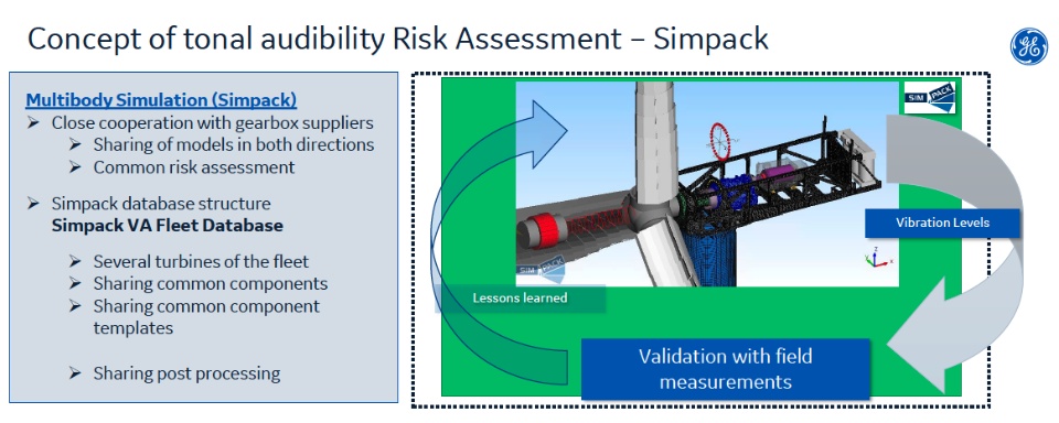 This presentation discusses the modeling of tonal noise contributions originated by gearbox teeth meshing, transmitted through complex, structure-borne transfer paths into the machine head, and radiated by tower and blade surfaces. A seamless tool-chain of multibody simulation and boundary element method to solve the wave equation is a core feature to integrate such an approach for risk assessment and analysis into established design processes. Its reliability and uncertainty need to be understood very well to drive design decisions early in the design phases.