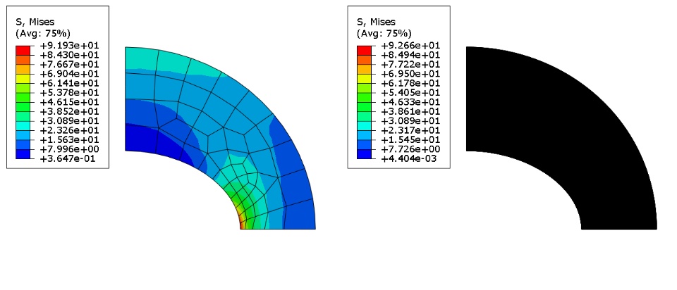 If you have taken heed in your finite element courses at university or participated in our 2-day seminar about Element Selection in Abaqus you should know that for stress concentration problems such as ours second order shape functions are recommended. The result with the reduced integration CPS8R is stunning: 0.08 mm mesh size, 836 elements, 5270 DOFs and 3.28e7 FLOPs will suffice.
