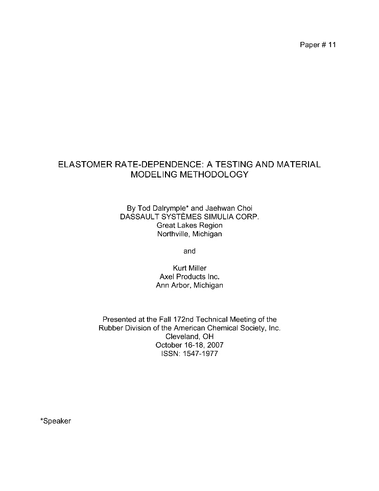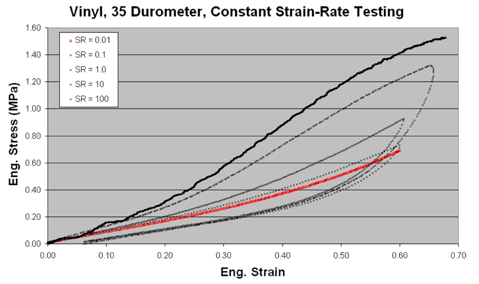 In recent years there has been a desire to model the time dependence of elastomers in other applications, such as the strain rate dependence of the material exhibited during the impact of a dummy model during a vehicle crash. The typical time frame of interest in these events is a fraction of a second. The attached paper documents the use of stress relaxation testing, taken at short times, to calibrate a Prony series viscoelastic material model for elastomers. The paper reaches the following conclusions: