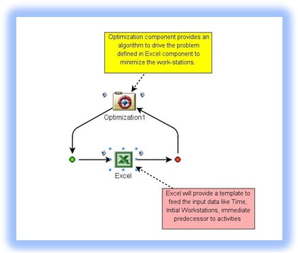 Above work-flow explains use of Excel component as well as Optimization component to arrive at minimum number of work stations. Excel template is used to feed the input data like Time, Initial workstations, and immediate predecessor workstation for each activity. Optimization component provides an algorithm to drive the problem defined in Excel component to minimize the work-stations. Constraints are defined using prologue/epilogue.