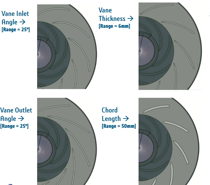 This optimization study focused on the diffuser geometry. There are four parameters to vary here: vane thickness, chord length, inlet angle and outlet angle. The complex interdependencies between these mean that all need to be considered at the same time in the optimization. The simulation was performed using CFD tools on the 3DEXPERIENCE platform.