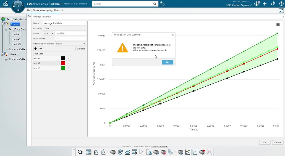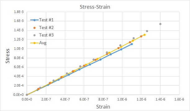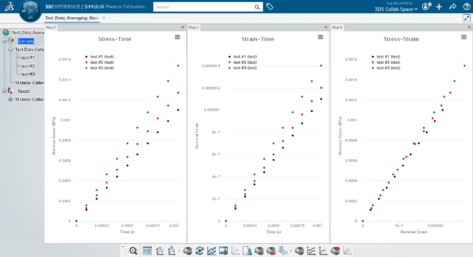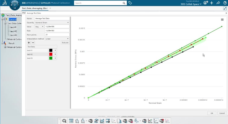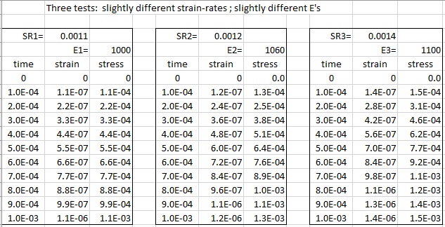 In the Elastic Example 1 the elastic modulus for each test repeat was identical. In this Example 2, we make the test data slightly more complex by making the elastic modulus have a small variation from test repeat to repeat. This Example 2 set of test data is attached in the zip file at the bottom of this post, as an Excel file and as a .3dxml file. The test data is shown in the image below after importing into the calibration app: