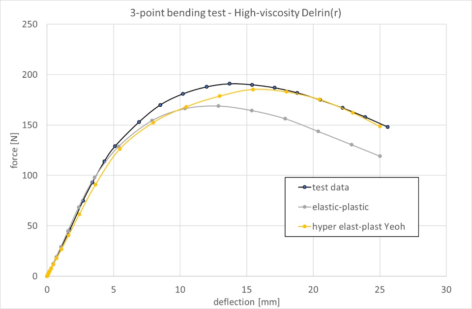 A simple 3-point bending test has been used to show the performance of an elastic-plastic model and a hyperelastic-plastic model for a high-viscosity Delrin(r). The images below show the Abaqus model used and the results of both the test and the simulation results.