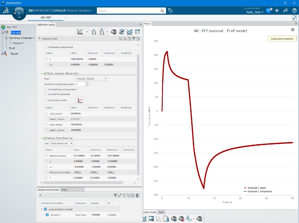 This TLVP material model has a lot of parameters to try to determine from just one test. It would be best to have several different tests to make a better determination. Since the creep law represents a nonlinear viscous behavior, different tests at different load levels would be a good idea. Also, it would be best to have several tests at different loading rates (strain rates).