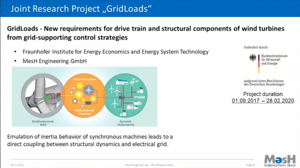 "New requirements for the drive train and structural components of wind turbines due to grid-supporting control procedures" have been identified in the "Gridloads" project, conducted by Fraunhofer IEE and MesH Engineering. This project examined the effects expected due to the application of new grid-supporting control procedures on wind turbines.
