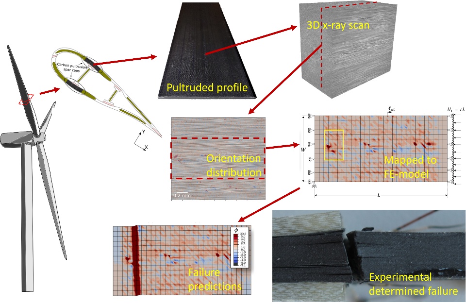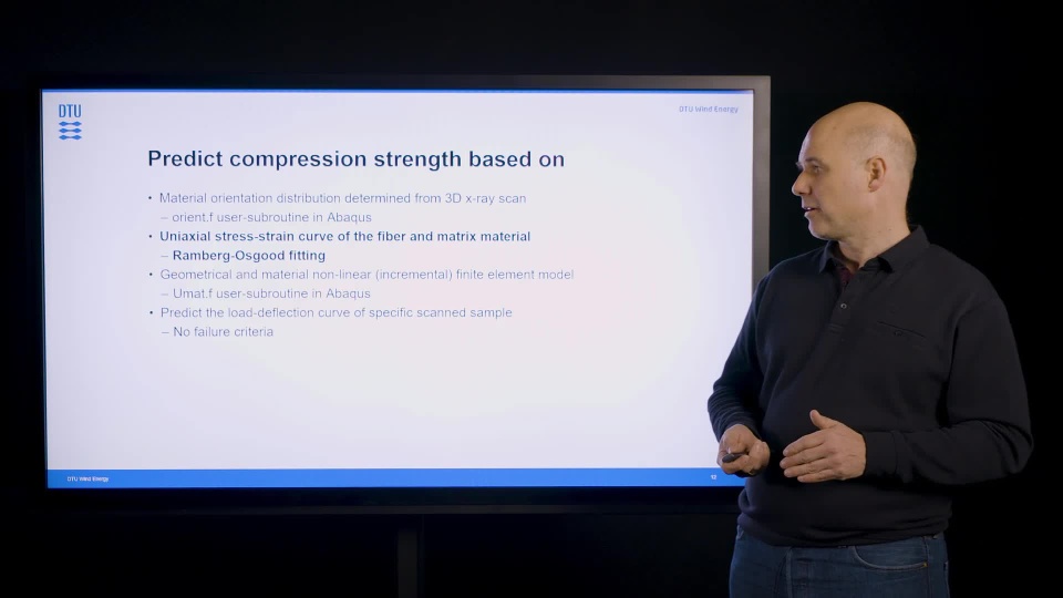 Large wind turbine blades rely on composite materials with excellent and predictable material performance. This presentation demonstrates different cases for modeling composites aimed at the wind turbine blade application. The demonstration will be given using the commercial finite element code Abaqus. The demonstration will cover the ability to model the actual fiber, bundle, and fabric architecture as well as the matrix material performance of specific composite samples. It will be demonstrated how a precise numerical representation of a full cross-section of a material test sample containing 100.000’s fibers is translated from full 3D x-ray CT scans to high fidelity finite element models. Some of this work includes a Fortran-based implementation of user-defined user-element and user-materials, as well as material orientation mapping.