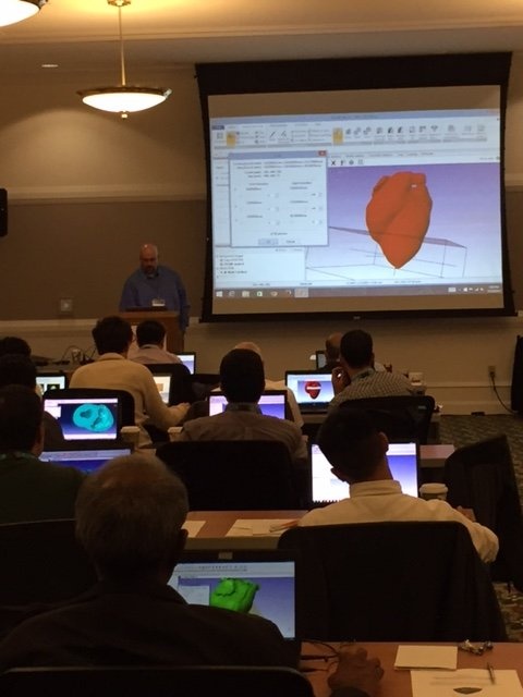 After lunch and little time to dissect a holographic heart simulation shown on the HP zVR display, the challenging workshop began with training on ScanIP image segmentation software from Simpleware. Tom Spirka systematically walked over 40 participants through the process of turning the scan data into a 3D volumetric mesh ready to be used in an FEA simulation. This was followed by the task of transforming their raw mesh into an accurate representation of the original heart. The goal was for each to create a fully coupled electro-mechanical model and get the heart to beat using the powerful laptops provided by HP. This portion of the workshop was led by SIMULIA’s Brian Baillargeon. By the end of the day, several of the virtual hearts were indeed beating and dozens of other enthusiastic people, many of whom had little experience with simulation tools but were undaunted by the challenge, were amazed by how close they were able to come in just an afternoon.