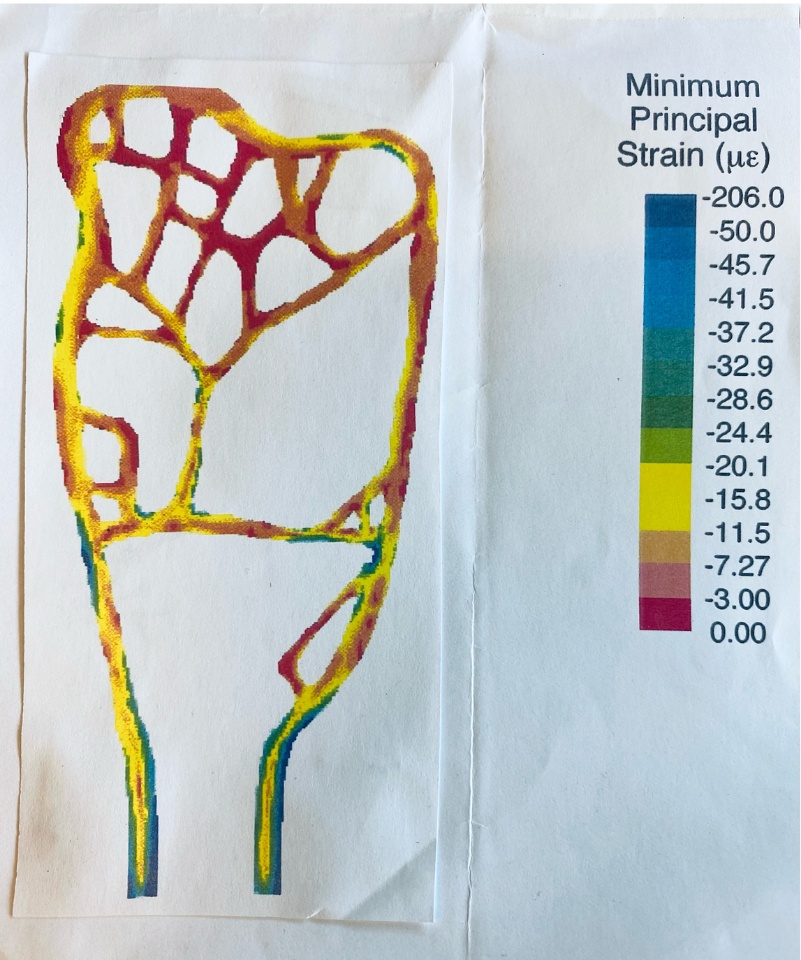 In the simulation result plot, you can see that when the femoral head of the shrew hip is loaded (the top left protrusion in the image), the load is fairly evenly transferred through the trabecular structure at the top of the bone, closet to the joint. There is, however, significant bending (and consequently high strain magnitudes in blue) in the lower portion of the femoral head where there are fewer supports.