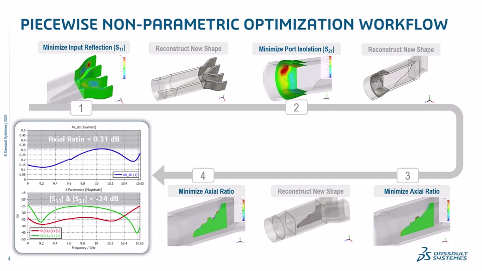 The new release of CST Studio Suite 2026 brings with it many enhancements for the Non-parametric Optimization workflow. In this demonstration, we use a Septum Polarizer to illustrate the potential of a true “non-parametric” shape optimizer. We propose a piecewise approach to find the best performance from this compact smooth-wall waveguide, suited for additive manufacturing.