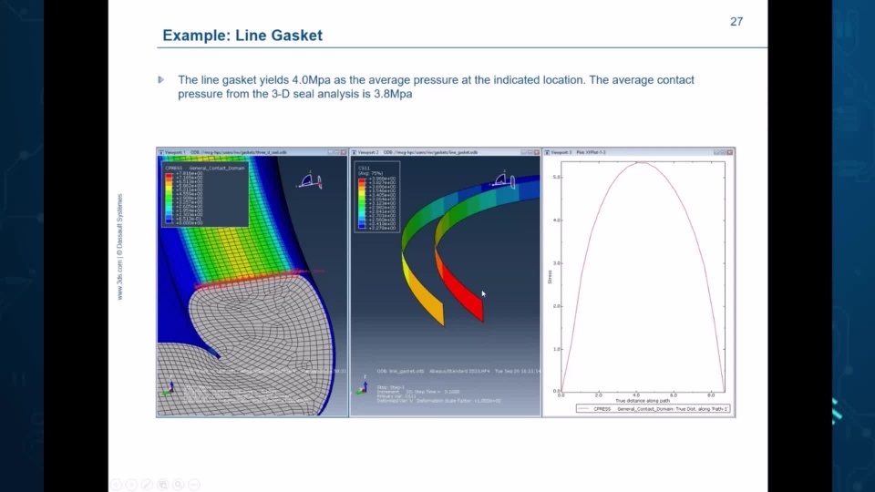 Sealing simulations with gaskets present a unique challenge to the structural analyst. The large difference between the in-plane and thickness dimensions coupled with the nonlinear thickness behavior make ordinary finite-element techniques inefficient or even impossible. Gasket elements allow Abaqus users to overcome these difficulties and efficiently simulate structures which contain gaskets. Damping in gaskets in dynamic simulations and through-thickness heat transfer can be included. Attendees will see an overview of gasket element types, learn how to define gasket behavior in terms of pressure/closure curves, and some examples of how gasket element applications. Anyone who needs to model with gaskets is urged to attend.