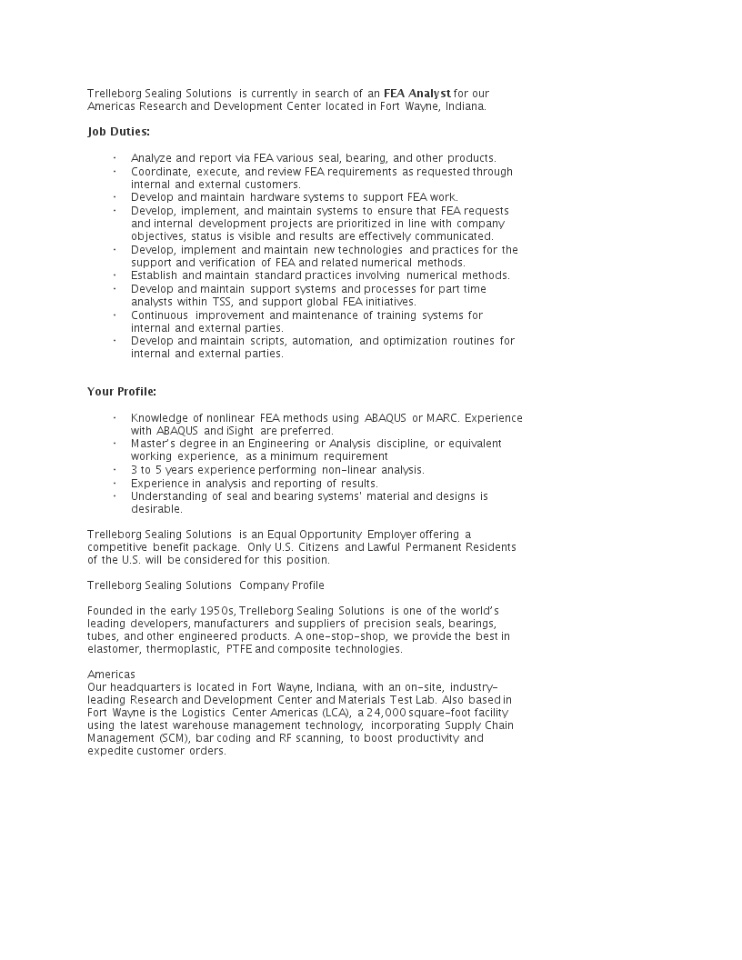 Trelleborg Sealing Solutions, a business unit of Trelleborg Group, has an immediate opening for a simulation expert, based in Americas R&D in Fort Wayne, IN. Working with R&D, design, and application engineering involved with seals, bearing, hoses, and other custom molded products provides an opportunity to have a variety of activities in a range of fast paced, growing markets using tools like ABAQUS, iSight and other simulation software.