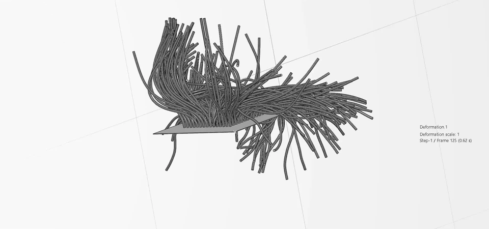 This is an impressive yet easy-to-build example of the general contact capabilities in Abaqus/Explicit. The hairs are hyperelastic rods, and a rigid ball knocks them down. The animation is from the Physics Results Explorer.