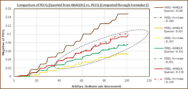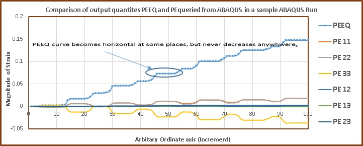 It is possible to determine the magnitude of PEEQ on basis of Plastic strain components. The corresponding simple formulae is “PEEQ = SQRT (2/3*((PE11*PE11+PE22*PE22+PE33*PE33) +0.5*(PE12*PE12+PE13*PE13+PE23*PE23)))”. The corresponding results when this formula is used is shown in the graph below (Graph 1).