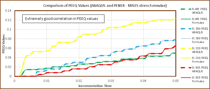 As PEEQ is the strain equivalent of Von Mises Stress, an alternative approach based on Von-Mises stress and PENER (The plastic energy dissipated per unit volume) is possible and was presented to the customer. The formulae for PEEQ on basis of MISES stress and PENER is –Similar to Mises stress, PEEQ is a non-negative scalar quantity. This equation-based upon PENER would be applicable to any case irrespective of it being Monotonic or Sinusoidal loading or it is small or large deformations. The corresponding PEEQ values calculated by this approach correlates extremely well with the Abaqus queried PEEQ values. The results from this approach are shown below in Graph 4.