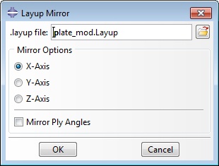 The second plugin mirrors layup files, allowing you to quickly create the other half of a symmetry model. Again, specify the name of the layup file and select the global axis corresponding to the mirror plane normal. You can also select whether to mirror the ply angles or not: