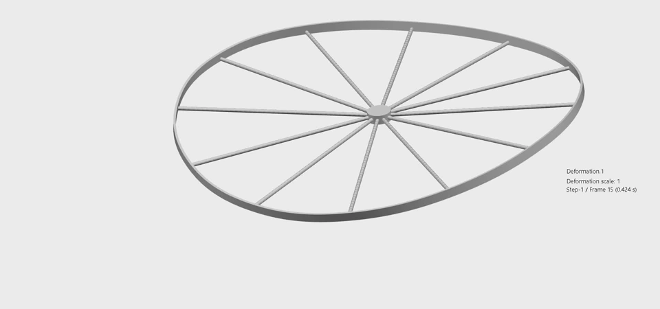 The video shows a two-step Abaqus/Standard simulation. The spokes are tensioned in step 1 from an initial stress. The structure contracts in step 2 when the temperature is lowered. One spoke contracts less than the others. The initial shape is seeded with an imperfection from a buckling analysis (*BUCKLE). The MP4 animation was made in the Physics Results Explorer app.