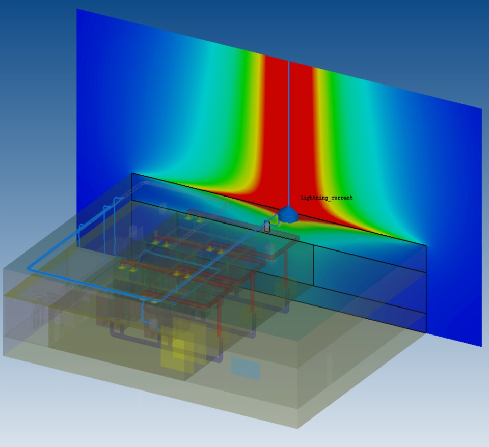 Physics-based simulation enables lightning/EMP vulnerabilities in digital infrastructure design to be evaluated before the construction of a new building, or before upgrading an existing building, to harden against electromagnetic effects. Different protection schemes can be analyzed to assess their effectiveness. Parametric sweeps and optimizers are used to study design tradeoffs and avoid over-engineering, thereby reducing building material costs.