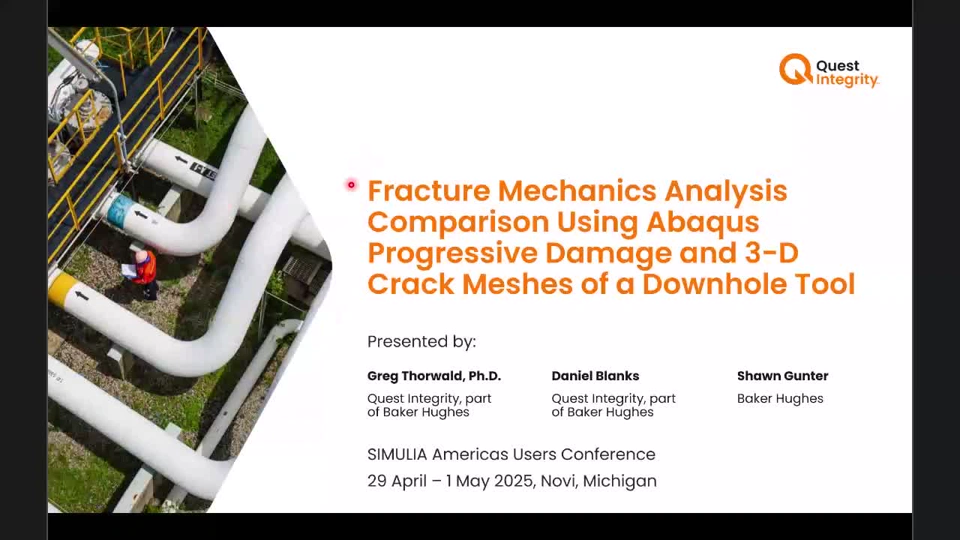 This presentation is about 17 minutes in duration. It is my presentation given at the 2025 SIMULIA Americas Users Conference. It describes two fracture analysis methods in Abaqus to evaluate the desired fracture deployment of a downhole well plug tool.