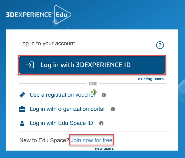 Existing users simply need to log in to 3DEXPERIENCE Edu Space with their 3DEXPERIENCE ID. New users can register using the link Join now for free.