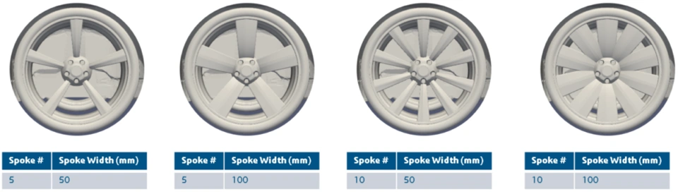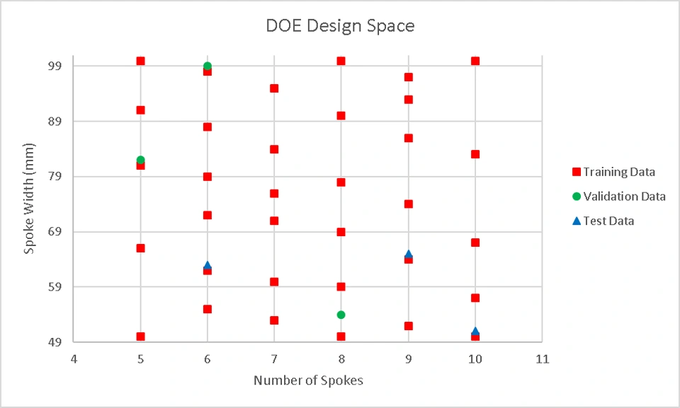 As a use-case, the following optimization study is analyzed: a design-of-experiment (DOE), where the tire spoke number and spoke width of the open-source DrivAer car geometry (see figure 3) are varied, with the optimization goal being the identification of the lowest vehicle drag configuration. In figure 4, the DOE design space is depicted. Red squares represent the simulation set that is used to train the ML models, green circles are the validation data points used in the ML training process to observe ML model convergence, and the blue triangles represent the blind test sets that will be used to see how well the ML models generalize to unseen vehicle geometries. The design space extremes are illustrated in figure 5.