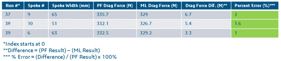 Now, one can look at the ML models predictive capabilities. For the blind test points, table 1 shows the drag force deltas between the true PowerFLOW results and the ML model outcomes and, more importantly, the percentage error. Evidently, the percentage error is around 2% for all three test cases, which is a very good outcome. Beyond that, the trained ML models were applied to all simulation points: training points, validation points, and test points. The associated accuracy of the predictions is depicted in figure 9. Here, one can clearly see that the error lies within the 3% error bound. It is also interesting to note that there is a bias in the ML model results; the ML models consistently under-predict the integrated drag force. Having looked at the integrated drag force, surface X-force distribution plots provide further insight into the predictive capabilities of the ML models. Figure 10 shows these surface contour plots from different angles and viewpoints for run 37 (similar plots are obtained for all other runs). It is quite clear to see that there is almost no difference between the true PowerFLOW results and the ML predicted results. This substantiates the claim that the ML models are good surrogates for expensive high-fidelity PowerFLOW aerodynamic simulations.