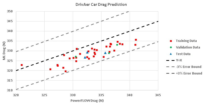 Overall, a multi-model machine learning approach based on simple feed-forward artificial neural networks has been validated for the use of external aerodynamic drag force prediction of clay-model-like vehicles. Once the ML model(s) have been trained on a single GPU for ~ 3 days, inferences (i.e. predictions) of drag force for unseen vehicle geometries take ~2 minutes as opposed to running a CPUhr intensive high-fidelity PowerFLOW simulation that takes ~6 hours on up to 300 CPU cores. Importantly, the percentage error between the true CFD PowerFLOW data and the ML model predictions of integrated drag force lies at less than 3%.