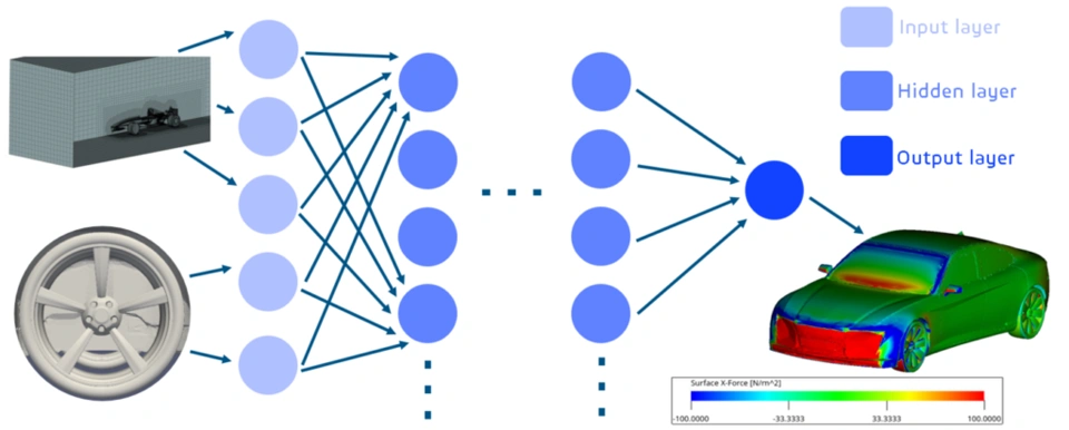 The study can be broken down into two segments: the CFD portion and the ML model part. During the CFD phase, 40 high-fidelity simulations are prepared in PowerDELTA, set-up in PowerCASE, run with PowerFLOW and some results are subsequently visualized in PowerVIZ as a sanity check that the data is reasonable. Each simulation takes about 6 hours and requires up to 300 CPU cores. Sample aerodynamic result visualizations are depicted in figure 6 for the Dassault Systèmes (3DS) E-car geometry. For this study, the critical surface field representation is the surface X-force distribution. Once the CFD data is collected, 34 simulation points are used to train deep learning neural network models that are written in Python with 3 simulation points used as validation points. A schematic of the feed-forward neural network models applied is depicted in figure 7 with the output data again represented by the 3DS E-car geometry. The input layer of the neural network models is fed with x-, y-, and z-coordinate data, as well as the spoke number and spoke width. This information is then propagated through the hidden layers of the neural network and, finally, at the output layer one obtains the surface X-force distribution of the vehicle. Training the neural network models takes approximately 3 days on a Windows workstation with a single GPU card. Meanwhile, the inference step, where the surface X-force distribution for vehicle geometries not seen during the neural network model training phase is predicted, merely takes several minutes.