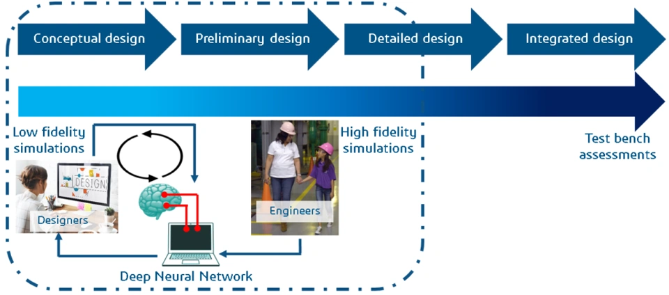 The idea is to embed the trained ML model(s) in the design stage such that the degree of fidelity that was previously only possible at the detailed design stage is now possible during the conceptual design phase as well, providing conceptual vehicle designers more aerodynamic insight into their proposed vehicle shapes and preventing late-stage design failures (see figure 2). Specifically, the goal of this work is to demonstrate that ML can be used as a surrogate model to reduce the use of CPUhrs intensive PowerFLOW CFD simulations for aerodynamic drag prediction, while significantly accelerating the compute time from several hours to merely several minutes.