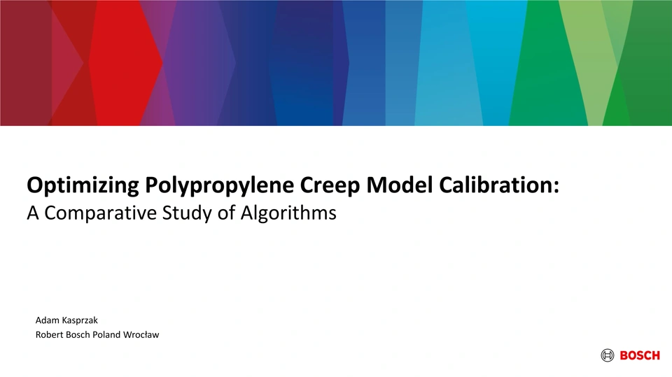 This presentation details the calibration of a numerical creep model for polypropylene, a material used by Robert Bosch in Wrocław for the production of brake fluid reservoirs. The creep model, implemented in Abaqus, was calibrated using the 3DEXPERIENCE Material Calibration platform. The calibration process involved fitting the parameters of a rheological model to experimental creep test data. The efficiency of different optimization algorithms, including the gradient-free Nelder-Mead and Hooke-Jeeves methods, was compared. The presentation includes a detailed comparison of the results obtained, analyzing the advantages and disadvantages of each algorithm in terms of accuracy, computation time, and convergence. Based on the real-world calibration, conclusions regarding the optimal algorithm selection for polypropylene creep modeling and guidelines for the effective use of the 3DEXPERIENCE Material Calibration platform in material engineering will be presented. The results are significant for precise modeling of brake fluid reservoir behavior under operational conditions.