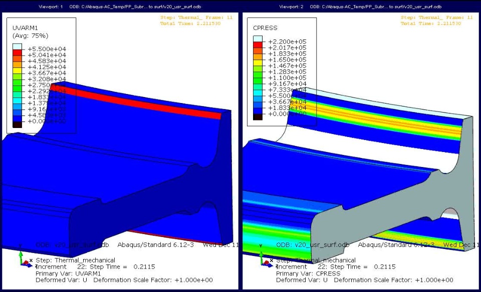 Structural deformations cause the seal contact point to shift, providing the opportunity for liquid to penetrate up to the contact point. Limitations were recognised within the FE software, which allowed unidirectional pressure penetration only. To overcome this limitation, a bespoke user subroutine was written to revise the contact algorithms within the Abaqus FE program. This enabled ‘contact pressure zones’ to correctly progress and (for the first time) regress in real time, with seal and seat movements. Video of seal ring shown below.
