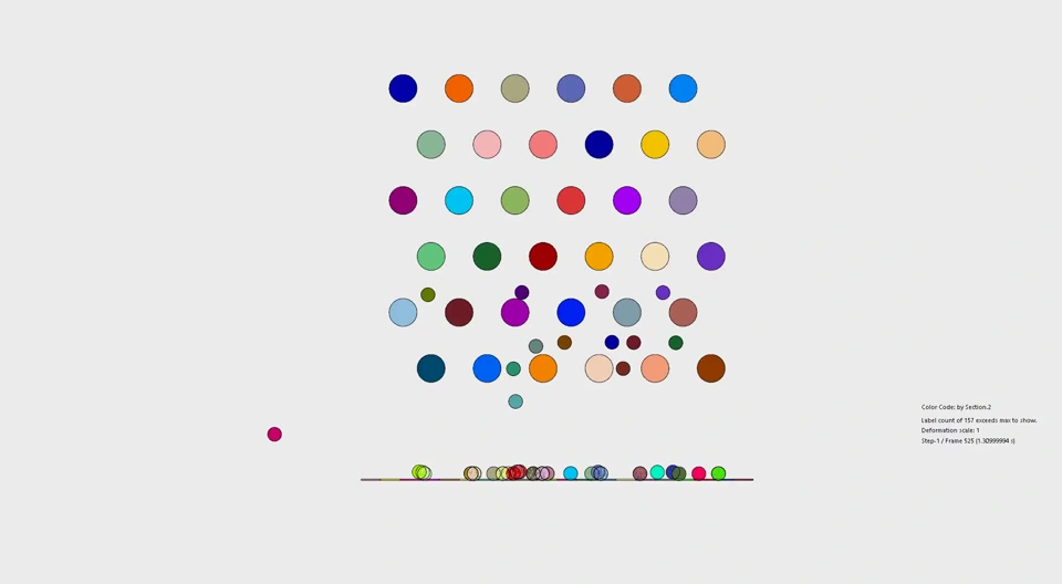 This is a 2-D Abaqus/Explicit simulation of 100 small rigid disks falling under gravity through a grid of larger rigid disks. The initial positions of the falling disks are very similar, but they end up scattered widely by the time they fall as far as the plate at the bottom. The animation is from the Physics Results Explorer app. There is no contact between the falling disks.
