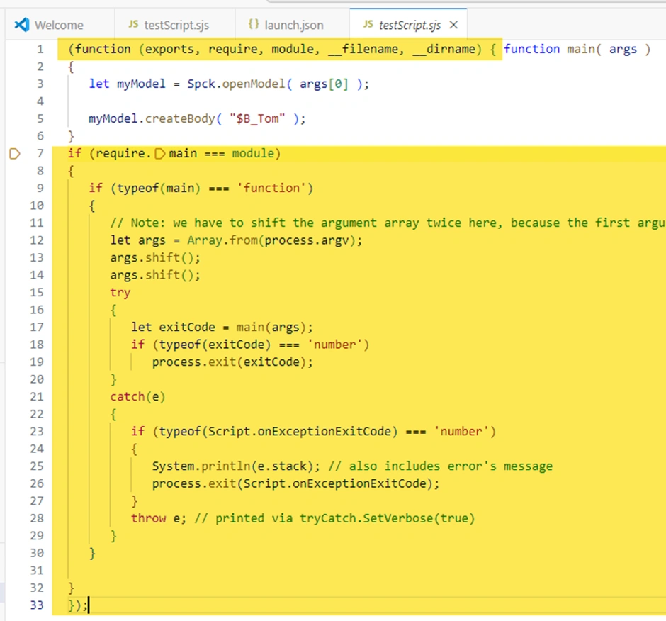 After starting the debugger by pressing ‘F5’, a modified read-only version of your Simpack script is opened with the cursor at the beginning of the executable code. So that Simpack scripts that contain a main function execute as expected, it is necessary for Simpack to automatically add some code to make sure that the main function is called - the passed parameters and any returned error code are then handled correctly.