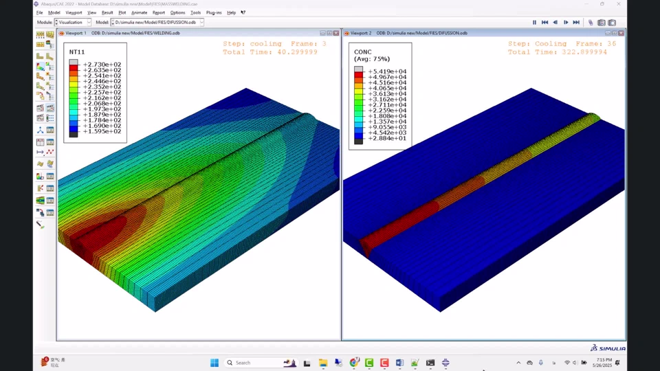 In this work, a 3D thermal 🔥 and mass diffusion 💧 analysis was performed using DC3D8 elements in Abaqus. A user-defined heat source was implemented via the DFLUX subroutine ⚙️ to simulate the welding process accurately. The heat transfer step consisted of welding (40 seconds) and cooling (800 seconds), followed by a mass diffusion step using the temperature field as input to model hydrogen migration in the base and weld metal.