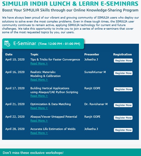 In April 2020, SIMULIA India conducted a series of e-seminars to facilitate awareness, learning & skill development during the COVID19 related lock-down in the country. This post contains the recordings & compiled question answers for these e-seminars.