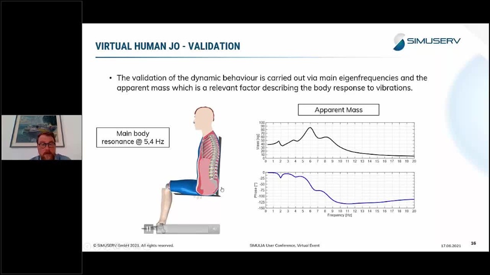 Using a virtual human model like Jo in combination with Fe model of a wheelchair enables this kind of analysis. The presentation will first cover the introduction of typical vibration levels. Second the virtual human Jo and its validation will be shown. Finally, a vibration analysis using Abaqus Explicit will be presented and the influence on the tissue loads will be evaluated.