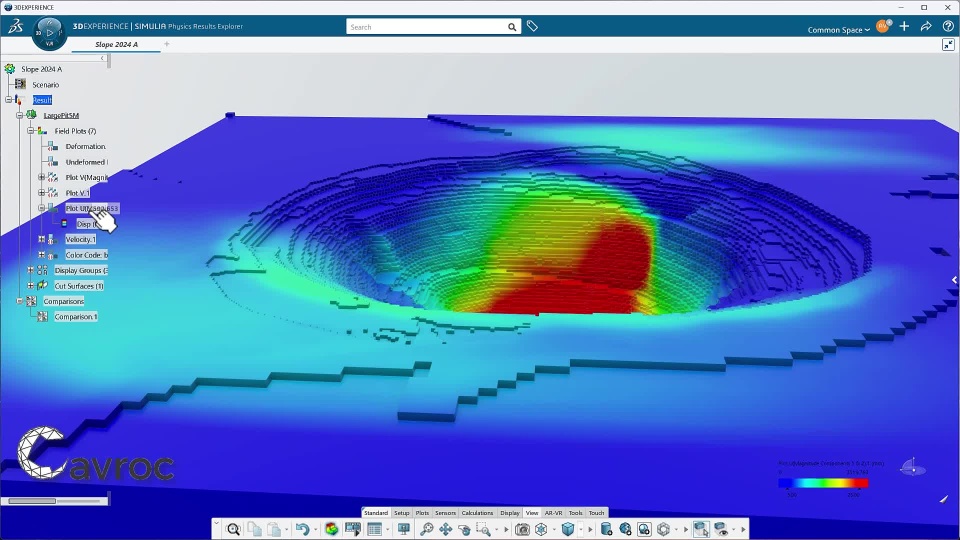 Slope stability analysis is a major design challenge for safe excavations in civil engineering and mining. In mining, very large open pit operations can exceed depths of 1000m, facing geotechnical challenges of high stress, deformation, complex geology with multiple rock mass domains and movement on major faults. Using SIMULIA Abaqus to perform a Shear Strength Reduction (SSR) test on this virtual twin of the mine, questions that used to take days to solve can now be answered in as little as 10 minutes. Abaqus/Standard's iterative solver allows fast equilibrium analysis in complex in-situ stress settings and Abaqus/Explicit's highly scalable, non-linear, quasi-static analysis capabilities combined with Cavroc 's IUCM material library for anisotropic rock mass provides realistic behaviour and ultimate performance.
