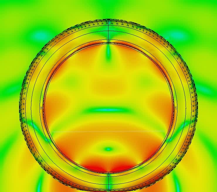 A tire is not, as one might initially think, just a rubber donut that one fills with air every couple thousand miles. The structure is a highly complex multi-layered assembly. All these sandwiched layers are made up of different materials such as nylon, steel webbing and different types of rubber. An accurate virtual representation that reflects this complexity is needed to perform detailed multiphysics simulation. Add to that the antenna whose operation and performance we want to evaluate. The antenna will often just stick to the inside of the tire’s sidewall; however, for truck tires where the sidewalls are often further reinforced with a steel sidewall, the antenna needs to be embedded in the tire during the manufacturing process as to not be stuck inside a faraday cage.